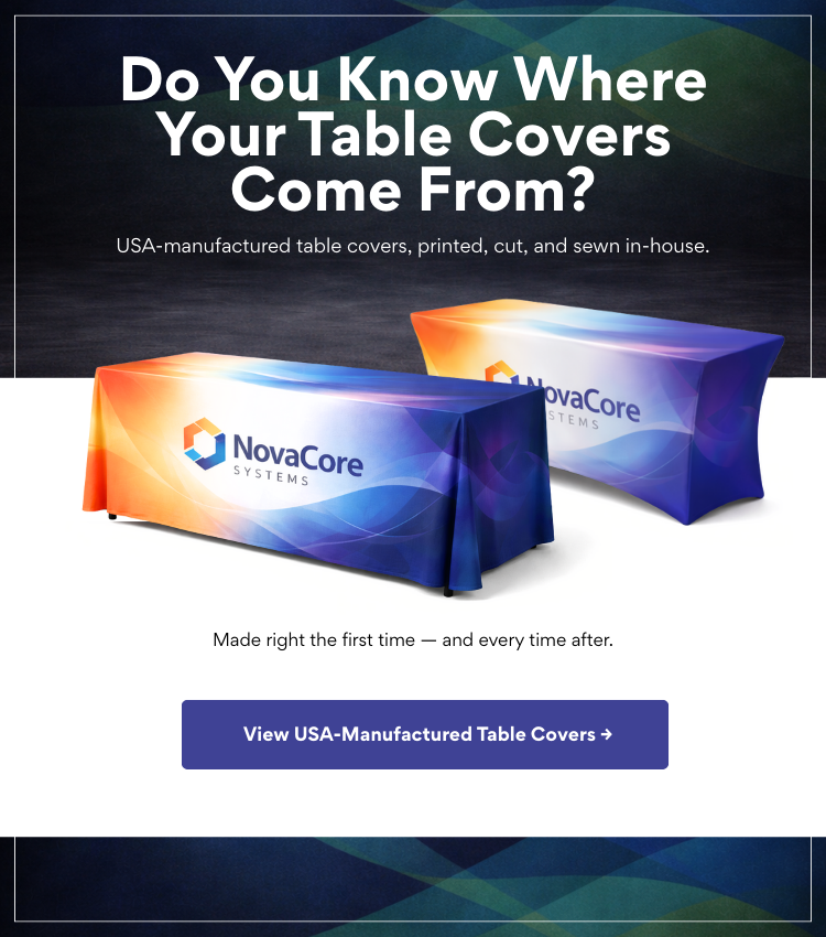 Stretch table covers with form-fitting construction and full-color fabric graphics for professional