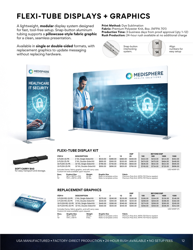 Flexi-tube displays with lightweight frames and full-color fabric graphics for events and exhibits.